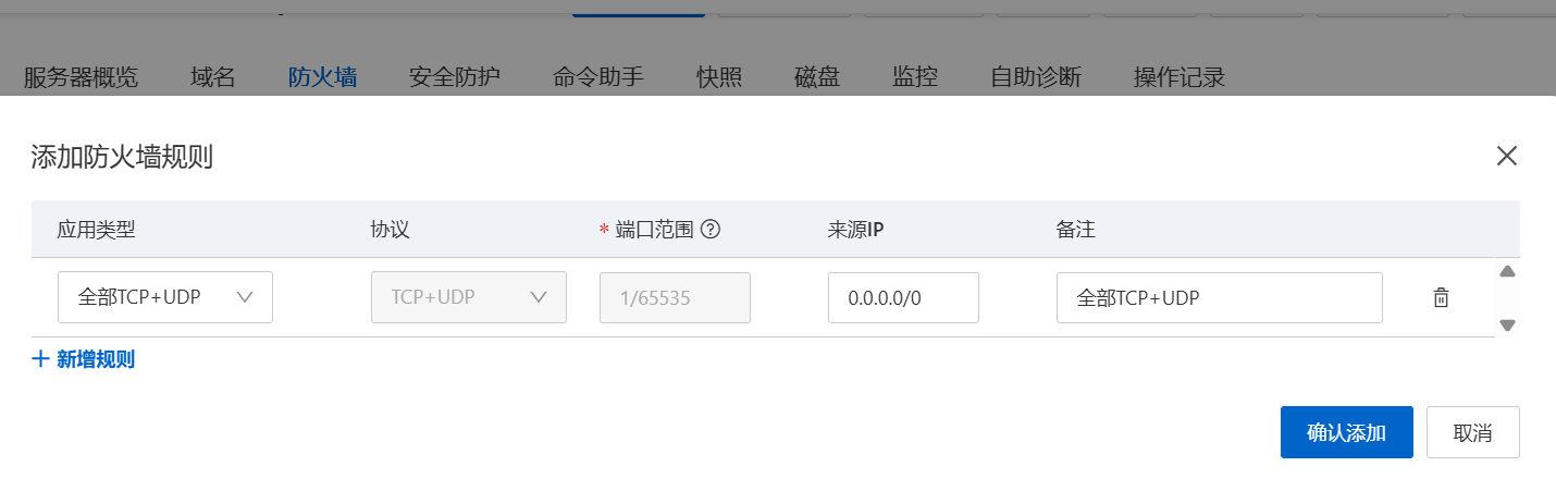 购买服务器之后,需要放开网络限制,才能访问到服务器。不同的云服务厂商,配置略有区别。在对应云服务商的管理界面,找到“安全组”或者“防火墙”配置,添加规则,如对服务器不了解则允许所有TCP/UDP连接(不推荐),饥荒联机已UDP连接为主,使用10999(地面)和11000(洞穴)两个端口,保险起见开放UDP端口10999-11002即可。