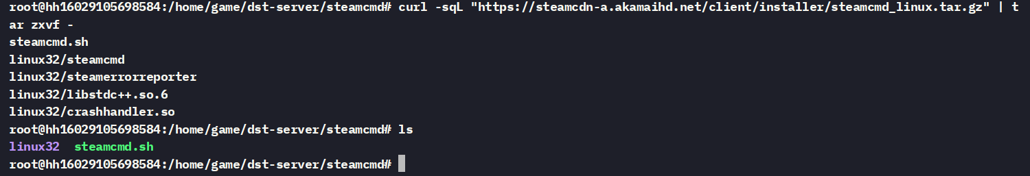curl -sqL "https://steamcdn-a.akamaihd.net/client/installer/steamcmd_linux.tar.gz" | tar zxvf -执行如下图: