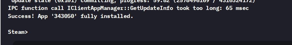~/dst-server/steamcmd/steamcmd.sh +force_install_dir ~/dst-server/dontstarve +login anonymous +app_update 343050 validate +quit安装完成后,会看到【Success! App '343050' fully installed.】界面显示如下: